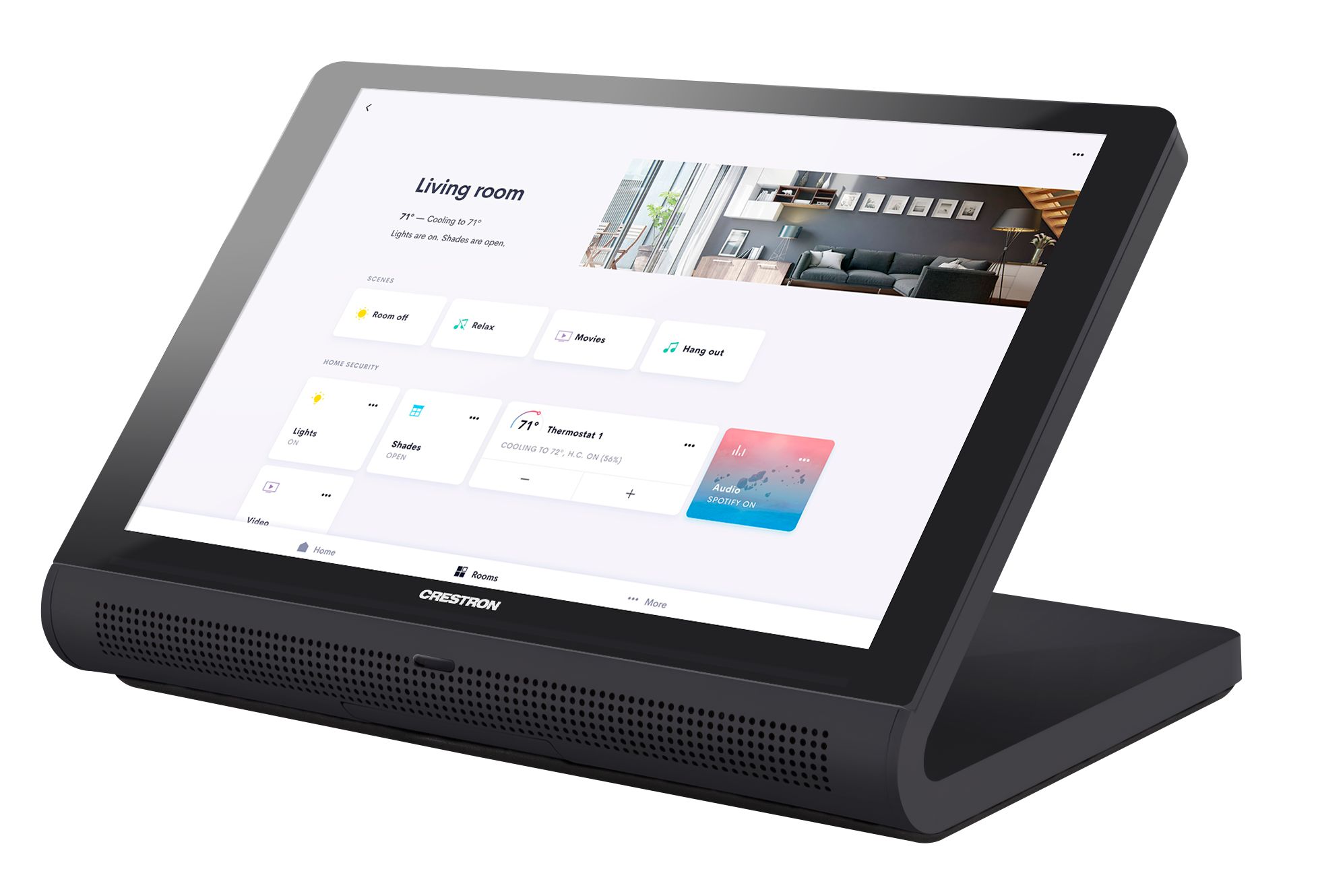 TS‑770:ä voidaan käyttää Crestron Home® OS -kokotaloratkaisun hallintaan. Valitse kosketusnäytöltä Crestron Home -sovellus ohjataksesi valaistusta, kaihtimia, ilmastointia, mediaa, turvallisuutta ja kameroita, mukaan lukien kyky luoda ja palauttaa tilannekohtaisia tunnelmia koko kotiin. TS‑770 voidaan asentaa jokaiseen huoneeseen, jotta pääset helposti käsiksi erilaisiin Crestron Home -toimintoihin sekä huoneessa että koko talossa.