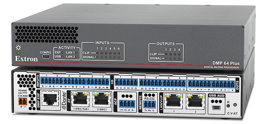 The Extron DMP 64 Plus series of compact Digital Matrix Processors features six DSP input channels with AEC, in only a half rack space. With a flexible mix matrix, a USB audio interface, and 6×4 analog connectivity, the DMP 64 Plus provides the ability to easily connect and route signals to accommodate system requirements. The AT models can be powered by PoE+ and provide 32×16 Dante connectivity for popular Dante microphone arrays, and other Dante devices, while the V models include up to eight VoIP lines for collaboration applications. Featuring an ACP bus for audio control panels, an expansion port for bidirectional digital audio connection with a DTP CrossPoint® or another DMP, eight audio file players, and configurable macros, the DMP 64 Plus can be used in a wide variety of smaller systems.