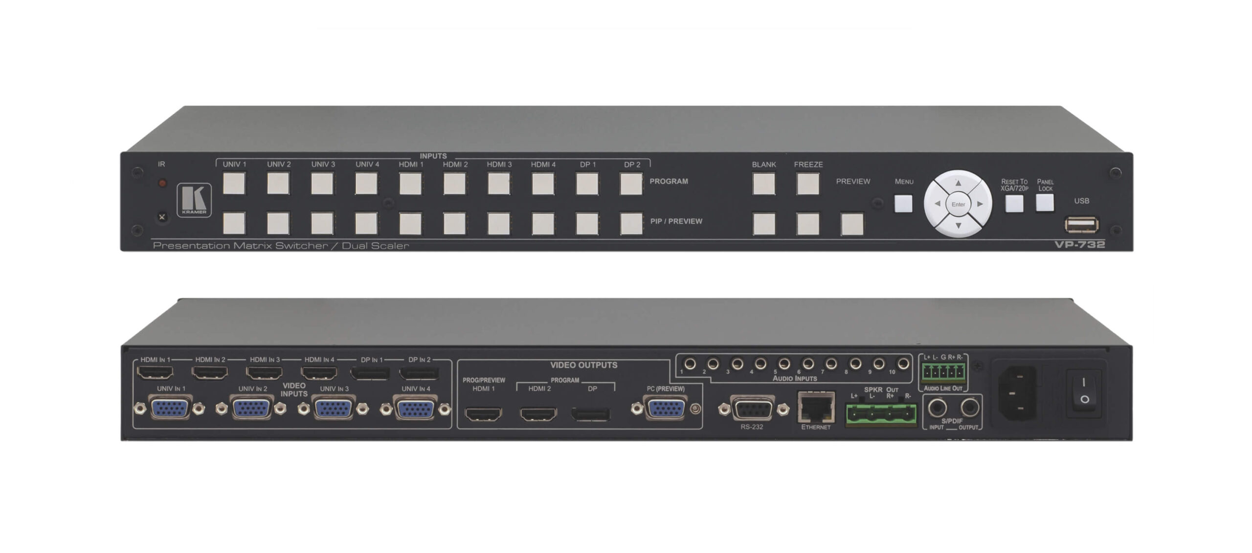 It up− and down−scales to selectable graphics or HDTV output resolutions to preview and program outputs (up to 4K30 UHD on the program output) and provides ultra−fast fade−thru−black switching between sources. VP−732 supports analog and embedded audio inputs and outputs and includes rich audio functionality and a stereo loudspeaker output.