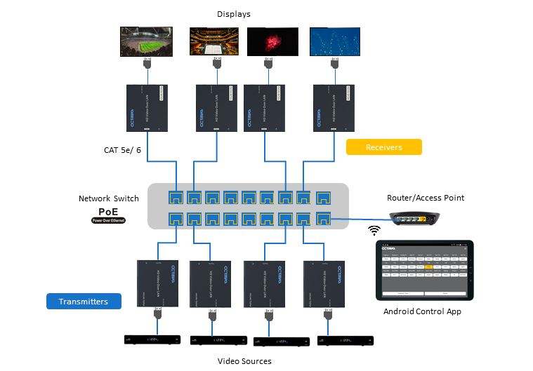 Octava AVLAN | PoE HD yli LAN / IP on helppokäyttöinen, skaalautuva videon siirtoratkaisu, joka mahdollistaa monilähteisten moninäyttöjärjestelmien suunnittelun käyttäen Ethernet-kaapeleita.